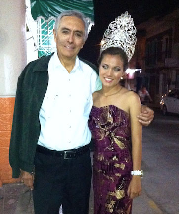 La lucha para ser reina de la feria 2014 en Tlapacoyan se está dando entre tres candidatas: Alexa, Carolina y Paola. Ganará la que logre vender más boletos para la rifa de un automóvil. En esta foto, sin embargo, nuestro cronista abraza a la reina actual, Lidia Mendoza Guzmán, quien al momento en que se las tomaron regresaba del Carnaval de Martínez de la Torre, en el que dignamente representó a Tlapacoyan. En una crónica posterior haremos un análisis de las candidatas actuales.