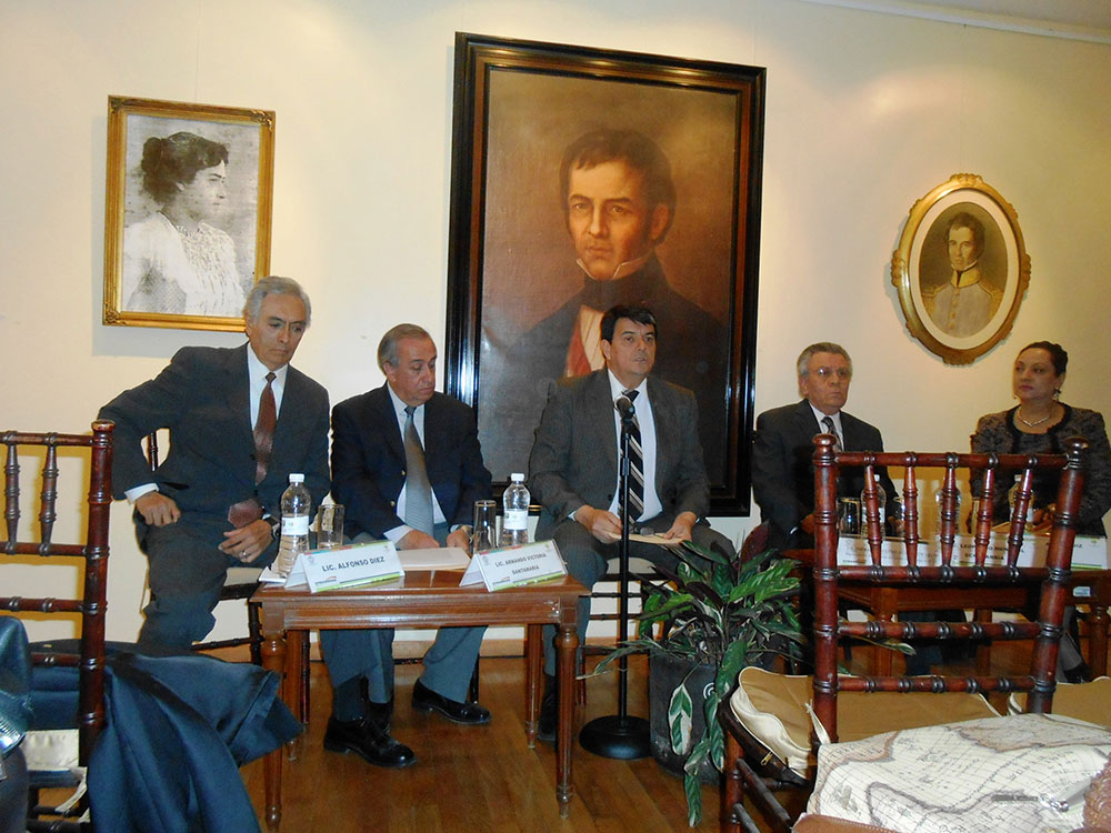 Alfonso Diez, Armando Victoria, Ulises Adame, Leopoldo Mendívil y Guadalupe Ruiz; tras ellos, los retratos de María Antonia, Guadalupe Victoria con la banda presidencial y el mismo con su uniforme