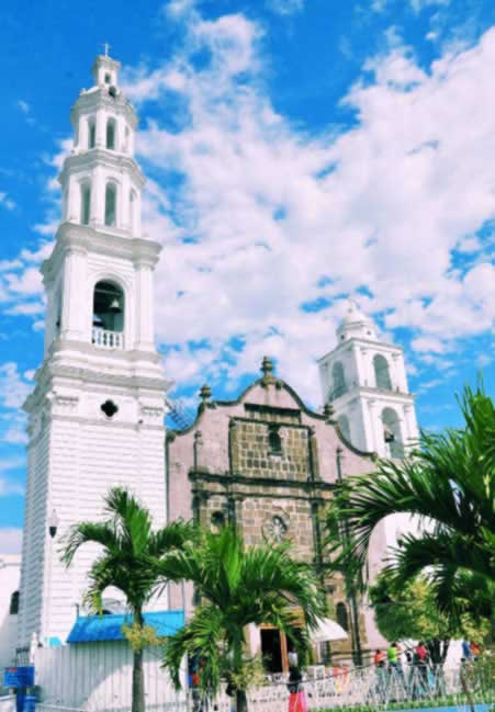 A la izquierda, la Parroquia de Santa María de la Asunción, en Tlapacoyan y a la derecha la Catedral de Santa María de Toledo; el parecido entre ambas deriva solamente de sus torres, a los lados, de diferente altura.