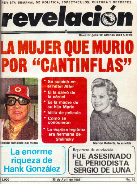 Fue cabeza principal en portada: “La mujer que murió por Cantinflas” y llevaba la foto del actor y de ella, Marion Roberts. De la página 5 a la 8 se plasmó el texto escrito por Bob con tres fotos de Cantinflas, dos de Marion y uno de un periódico de la época de los hechos que se describían, de noviembre de 1961, con una cabeza que decía: Suicidio por Cantinflas y abajo un sumario en el que se leía: “Bella rubia se envenenó en el Hotel Alfer”, “Vivió un trágico romance con el gran actor” y fotos de la fachada del hotel y de Marion. Además, la página 9 de Revelación reproducía lo que publicó el periódico bajo el título de : “La nota de La Prensa en diciembre de 1961”.